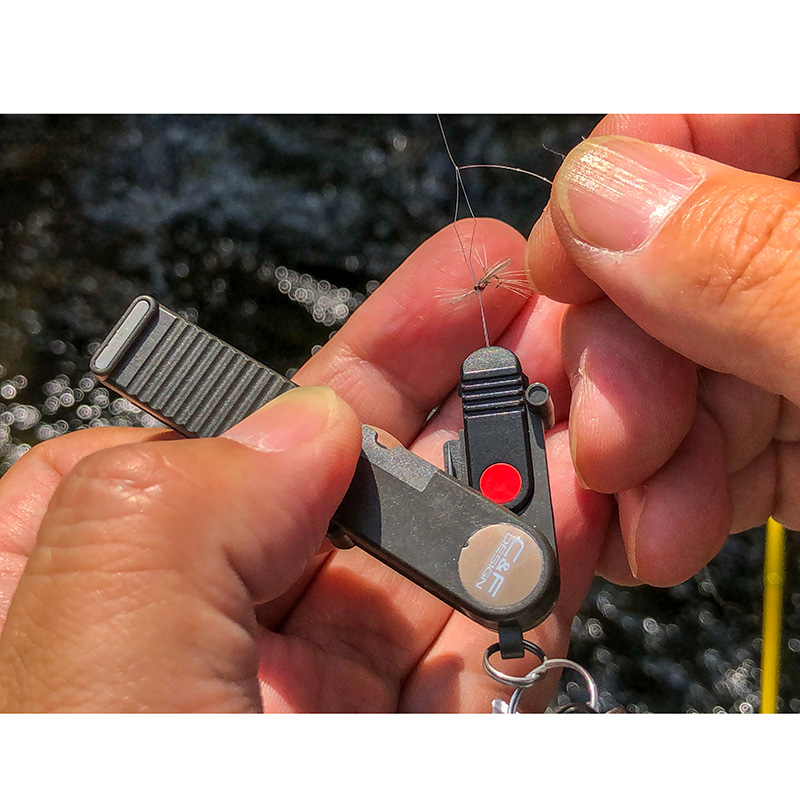 Clipper con lama sostituibile e portafiletti. Aggiunta di una piastra in alluminio per ricevere i colpi della lama e trasformarla in un clipper più affilato. La lama trattenuta da un magnete può essere facilmente sostituita, in modo da poterla mantenere sempre affilata. Il clipper è dotato di un supporto per il filettatore incorporato, mentre il pulisci occhi e il filettatore all’interno sono utili per cambiare le mosche durante le ore di scarsa illuminazione. Il magnete sulla superficie del clipper è utile per catturare le mosche.